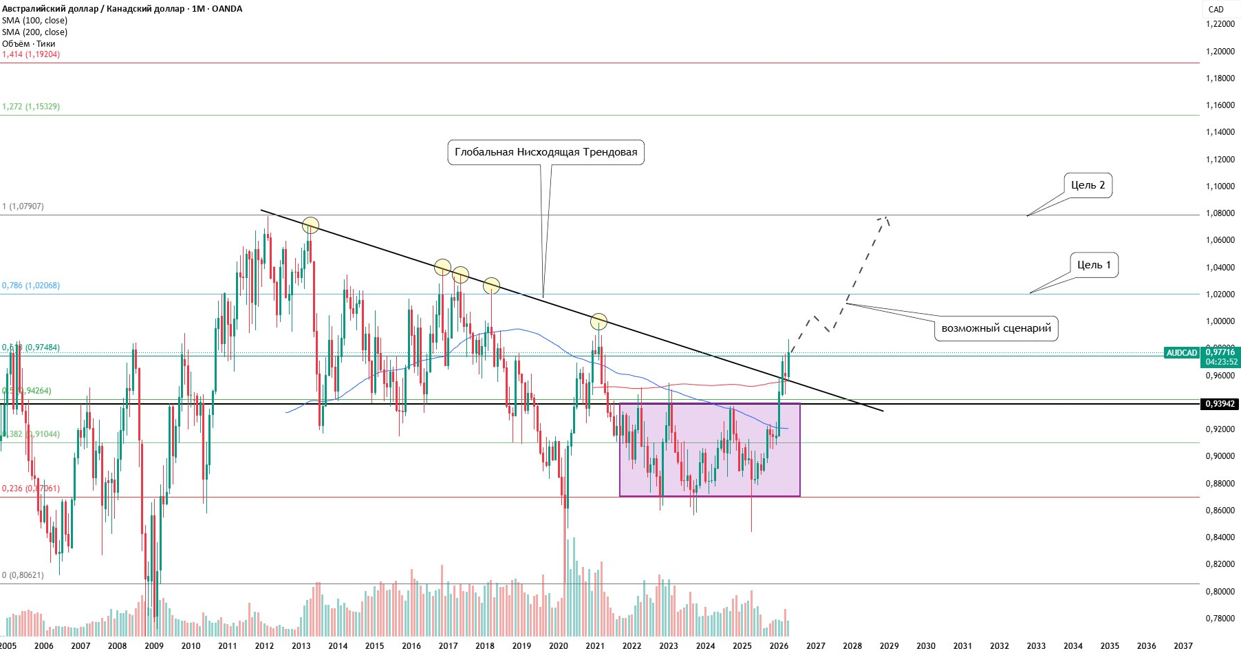 Валютная пара AUD/CAD на месячном таймфрейме начала отрабатывать паттерн «прямоугольник».