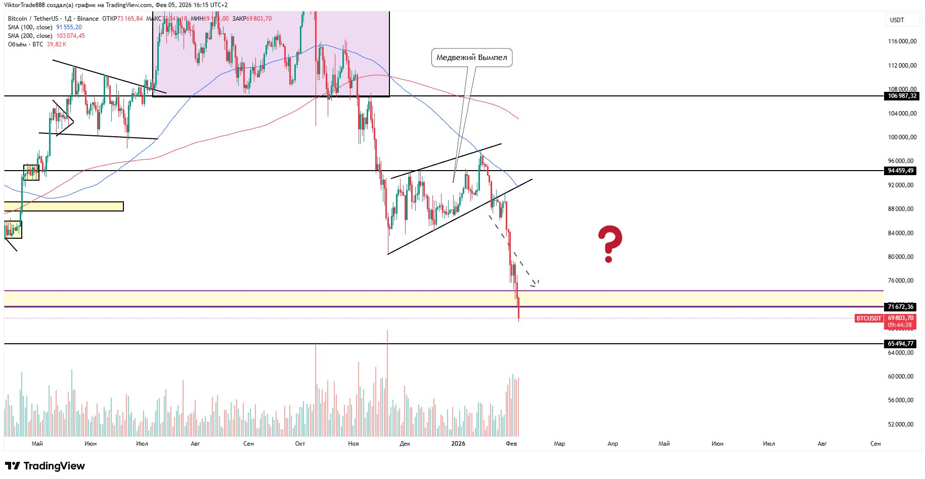 Рассмотрел текущую ситуацию по Bitcoin.Пошла отработка медвежьего вымпела, дополнительно сформировалась сильная разворотная структура, которая усиливает сценарий снижения..