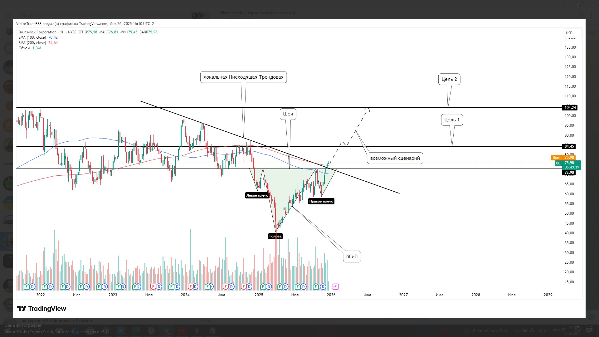 На графике Brunswick Corporation (BC) на недельном тайм-фрейме после нисходящего движения сформировался паттерн «Перевёрнутая голова и плечи» — классическая разворотная модель.