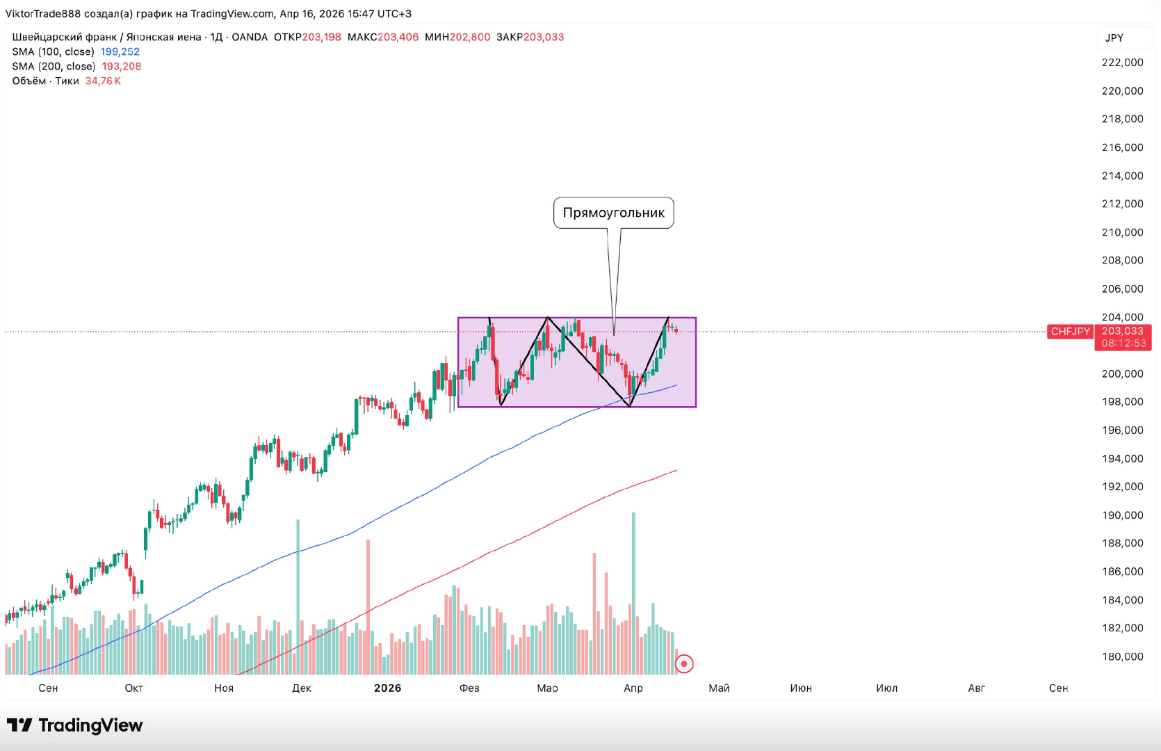 Рассматриваю валютную пару CHF/JPY на дневном таймфрейме. После устойчивого восходящего движения цена перешла в фазу консолидации и сформировала классический паттерн «прямоугольник».