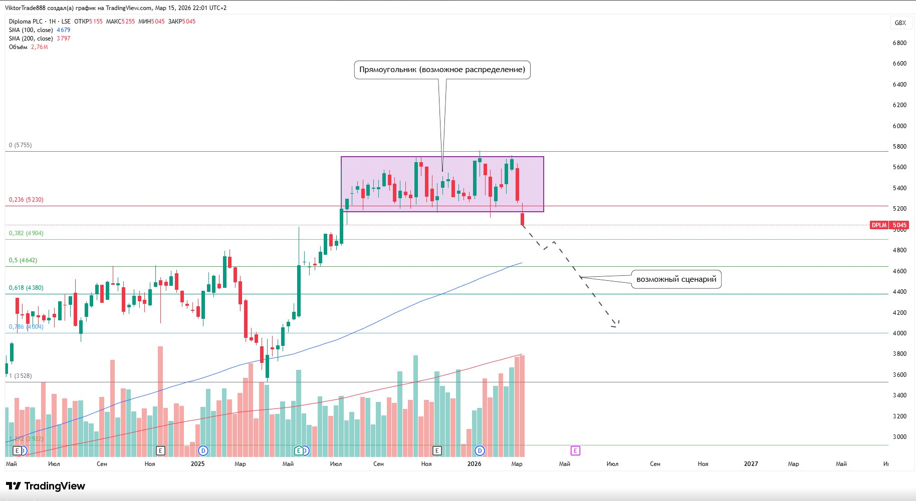На недельном таймфрейме после устойчивого восходящего тренда сформировался паттерн прямоугольник. Такая структура часто выступает фазой консолидации, а в верхней части тренда может указывать на возможное распределение.