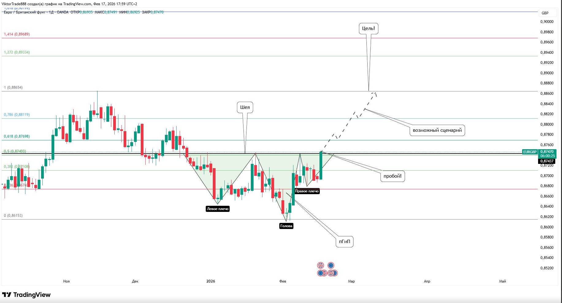 На дневном таймфрейме после краткосрочного нисходящего движения сформировалась перевёрнутая «голова и плечи» — классическая разворотная конструкция.