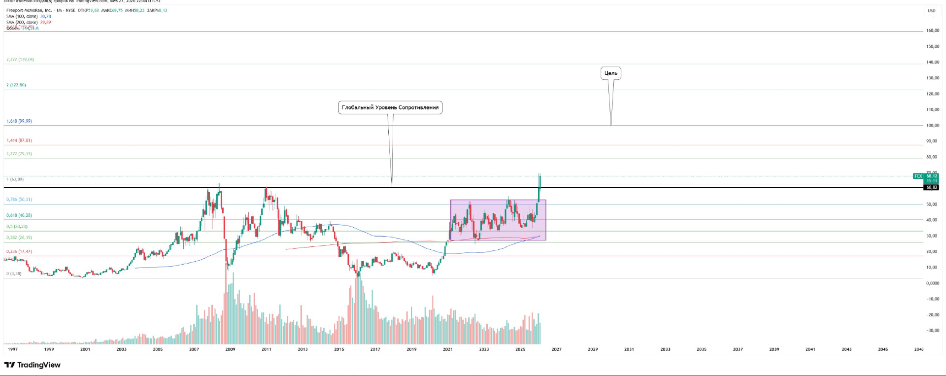 Акции Freeport-McMoRan Inc. (тикер FCX) на месячном таймфрейме после отработки паттерна «прямоугольник» подошли к глобальному уровню сопротивления.
