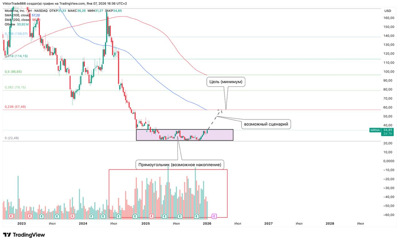 После затяжного нисходящего тренда по Moderna сформировалась консолидация в виде прямоугольника. Цена несколько раз тестировала верхнюю границу диапазона и сейчас снова к ней подтягивается +мы видим мощное повышение объёмов.