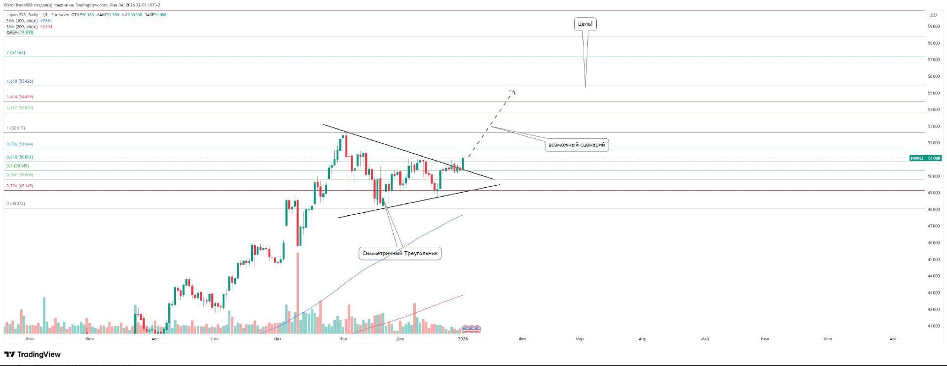 По японскому индексу Nikkei на дневном тайм-фрейме после устойчивого восходящего тренда сформировался паттерн «Симметричный треугольник».