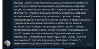 Я занимаюсь трейдингом не так уж давно. уже около 2-х лет и это только крипторынок (так как понятия не имел как работать с другими рынками). Я смотрел много курсов где были обещания стать милионером за месяц.но в реальности это не работало, а нервы курили в сторонке.