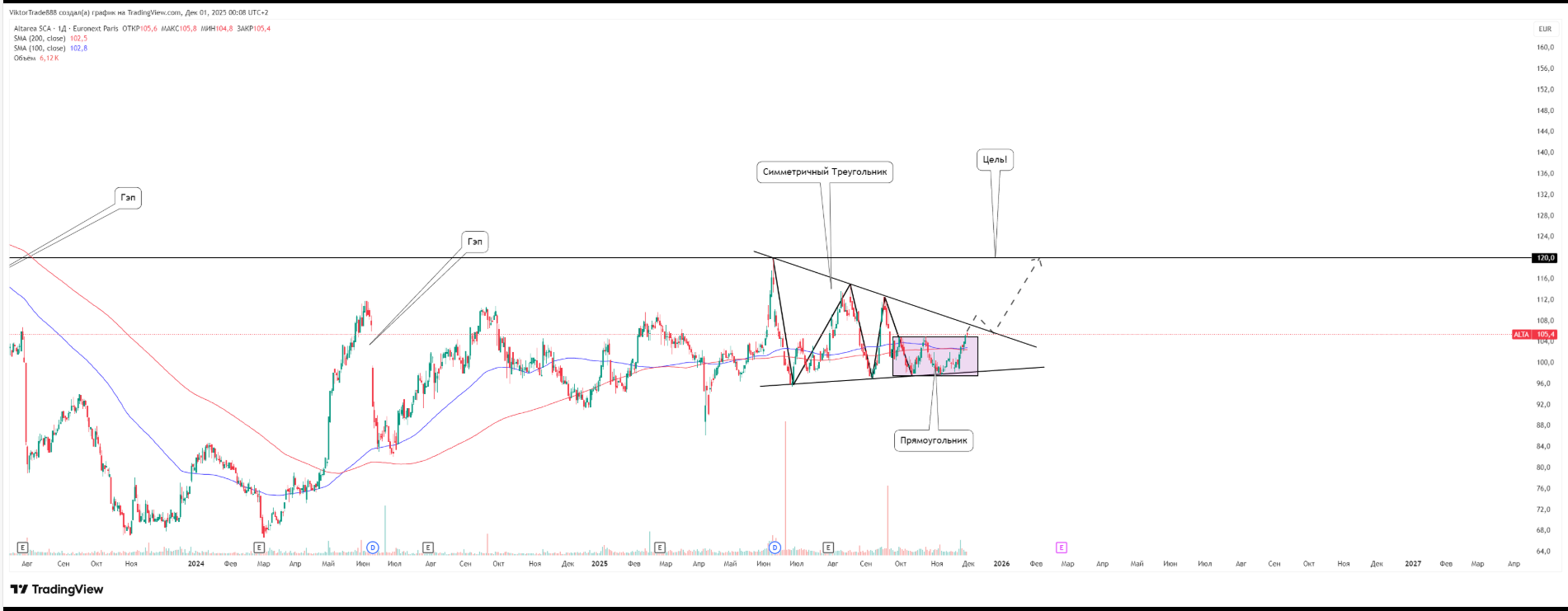 По Altrarea SCA на дневном таймфрейме сформировался крупный симметричный треугольник. Внутри него у нижней границы цена создала локальный паттерн «прямоугольник».