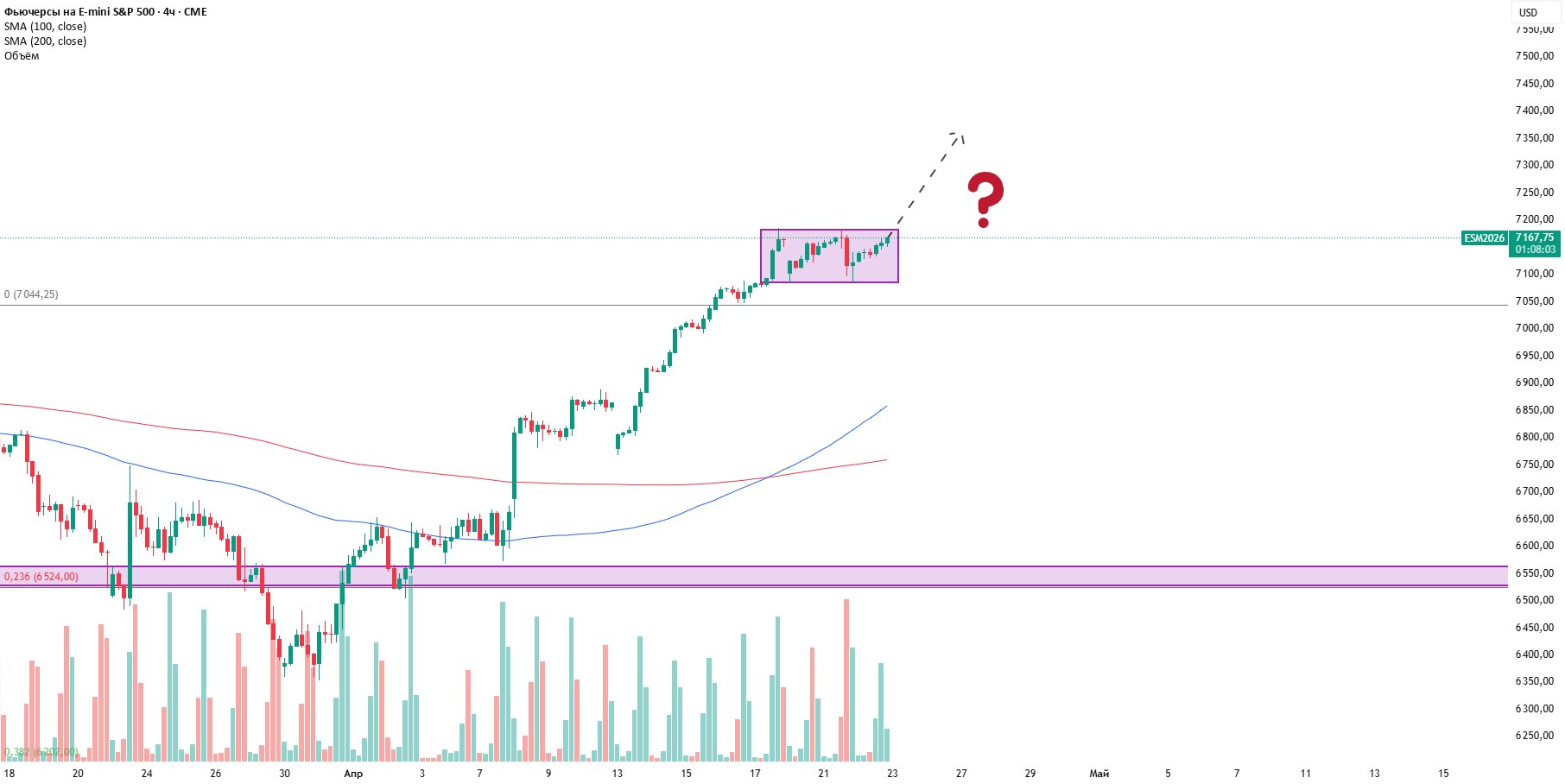 По индексу S&P 500 специально перешёл на 4H таймфрейм, чтобы показать текущую структуру после сильного импульсного роста.