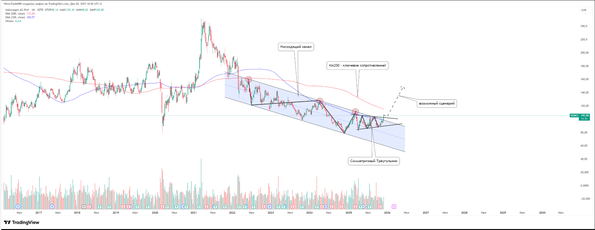 На недельном таймфрейме по VOW3 сформирован чёткий нисходящий структурный канал.
